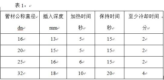4)從現(xiàn)在開始即進入加熱時間,并加熱至表1中規(guī)定的時間。規(guī)定的加熱時間到達后,從加熱模頭上拔出管材和管件,拔出速度應(yīng)適中,不能過急,但可以略帶輕微的抖動動作,以利于拔出。