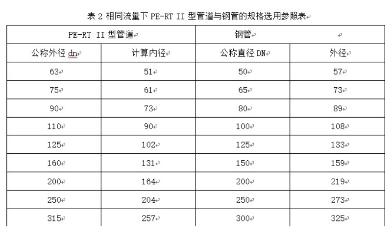 與鋼管比較,PE-RT II型管道的摩擦阻力小,同樣內(nèi)徑的管材流量是鋼管的1.25倍,隨著鋼管的腐蝕,內(nèi)壁會(huì)變得更加粗糙,流量也會(huì)逐年降低,相同流量的情況下,PE-RT II型管道與鋼管的規(guī)格選型見表2