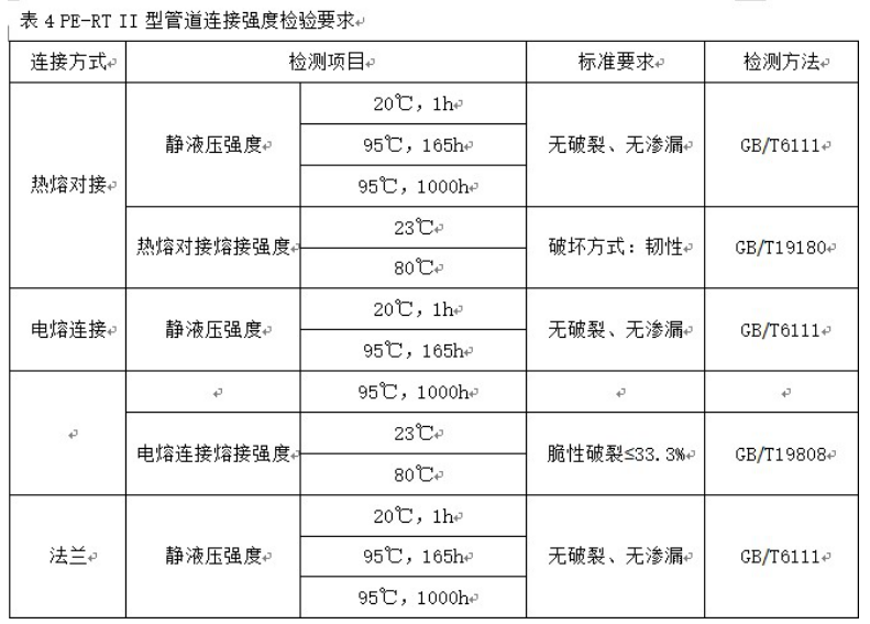 PE-RT II型管材、管件參照GB/T28799-2012執(zhí)行,管道連接強(qiáng)度要求詳見表4